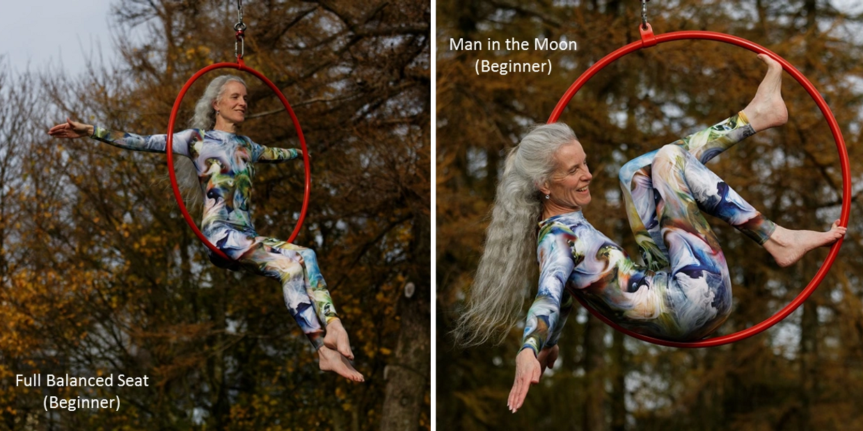 Many hoop moves challenge and work your ability to balance. Beginner moves Full Balanced Seat and Man in the Moon are great examples. Full Balanced Seat looks so simple, but the whole body has to work hard to stay seated if there is no additional steadying support from the arms.