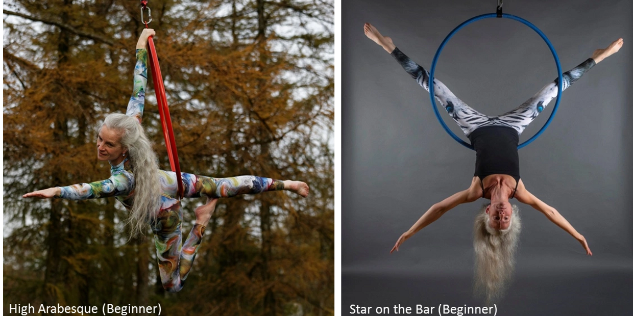 High Arabesque and Star on the Bar are good examples of where the body's weight is pressing down on the steel. I still find Star on the Bar a challenge. I don't have much padding and the bones in my lower back feel very close to the steel. In High Arabesque, that steel is pressing on my right inner thigh, which takes a bit of getting used to. In High Arabesque, I am also hanging from the top bar by my right hand. Hands also need to get used to the steel, and must develop a strong grip and tougher skin.