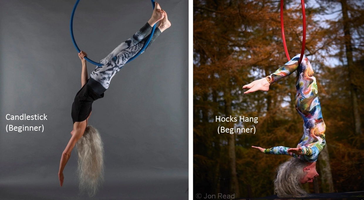 Some beginner moves involve hanging the body off the hoop by the hands, ankles (Candlestick), knee-backs (Hocks Hang), elbow-creases—anywhere you can hook on. (One advanced move involves hanging from your heels! Somewhat incredible.) Hangs differ from drapes in that they require much more tension in the muscle groups. Hanging improves strength, stability, and flexibility. For example, hanging by the hands improves wrist, arm, and grip strength, and works your shoulders, back, and core muscles.