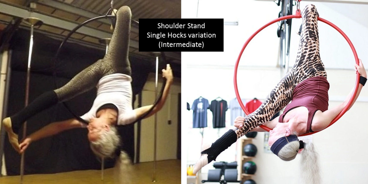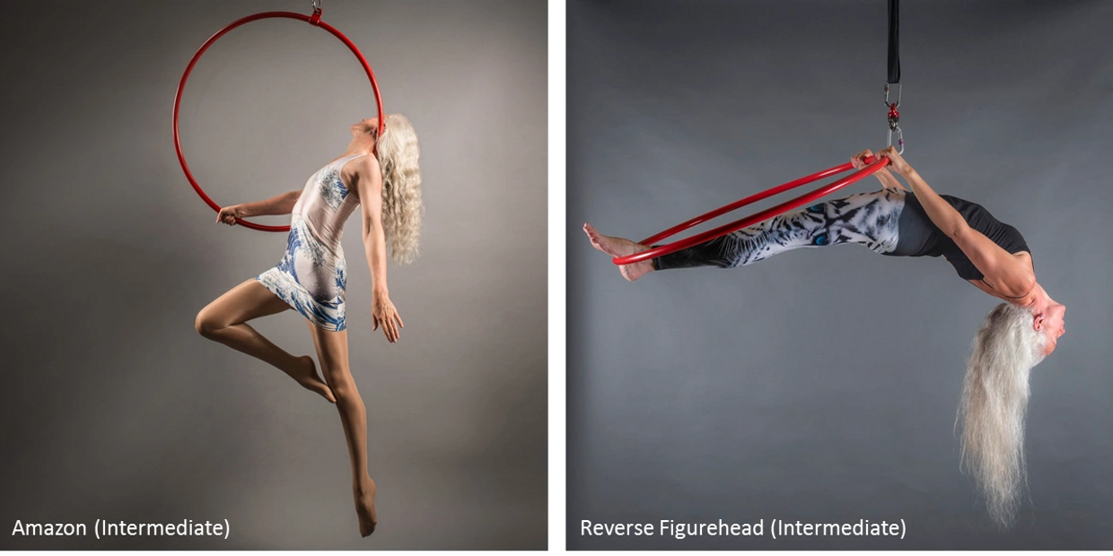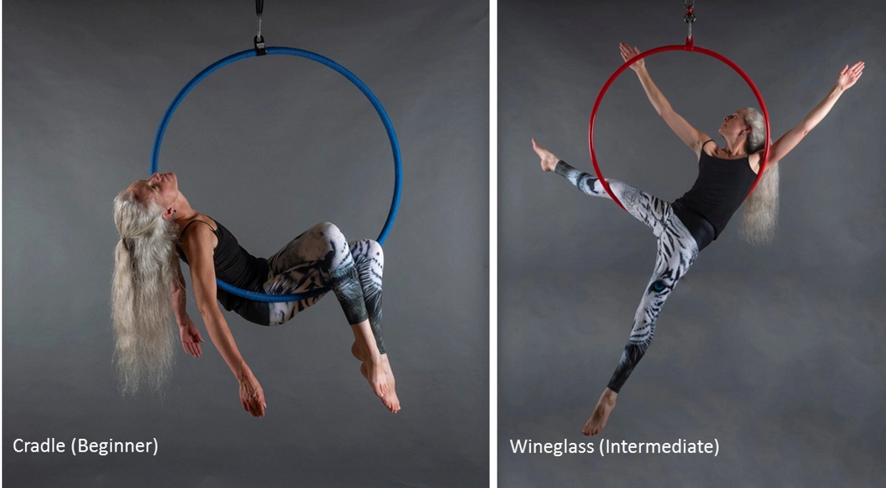 An example transition is from Cradle (beginner) to Wineglass (intermediate). From Cradle you unfold your top leg and drop the foot, while extending your other leg upwards keeping it behind the hoop, and moving the opposite arm and shoulder behind the hoop. So now you know!